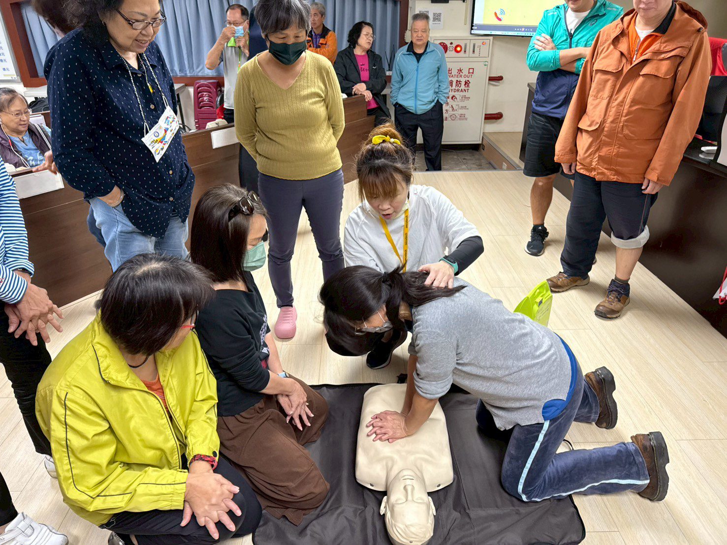 消防局災害管理科科員陳偉建介紹「個人與居家防護措施」,以常見的地震及其他災害為例,介紹平時減災與災時應變的準備重點。在「基礎急救」課程中,由具備 EMTP(高級救護技術員)資格的周佳慧教官授課,以互動方式帶領志工掌握生命救援技能。