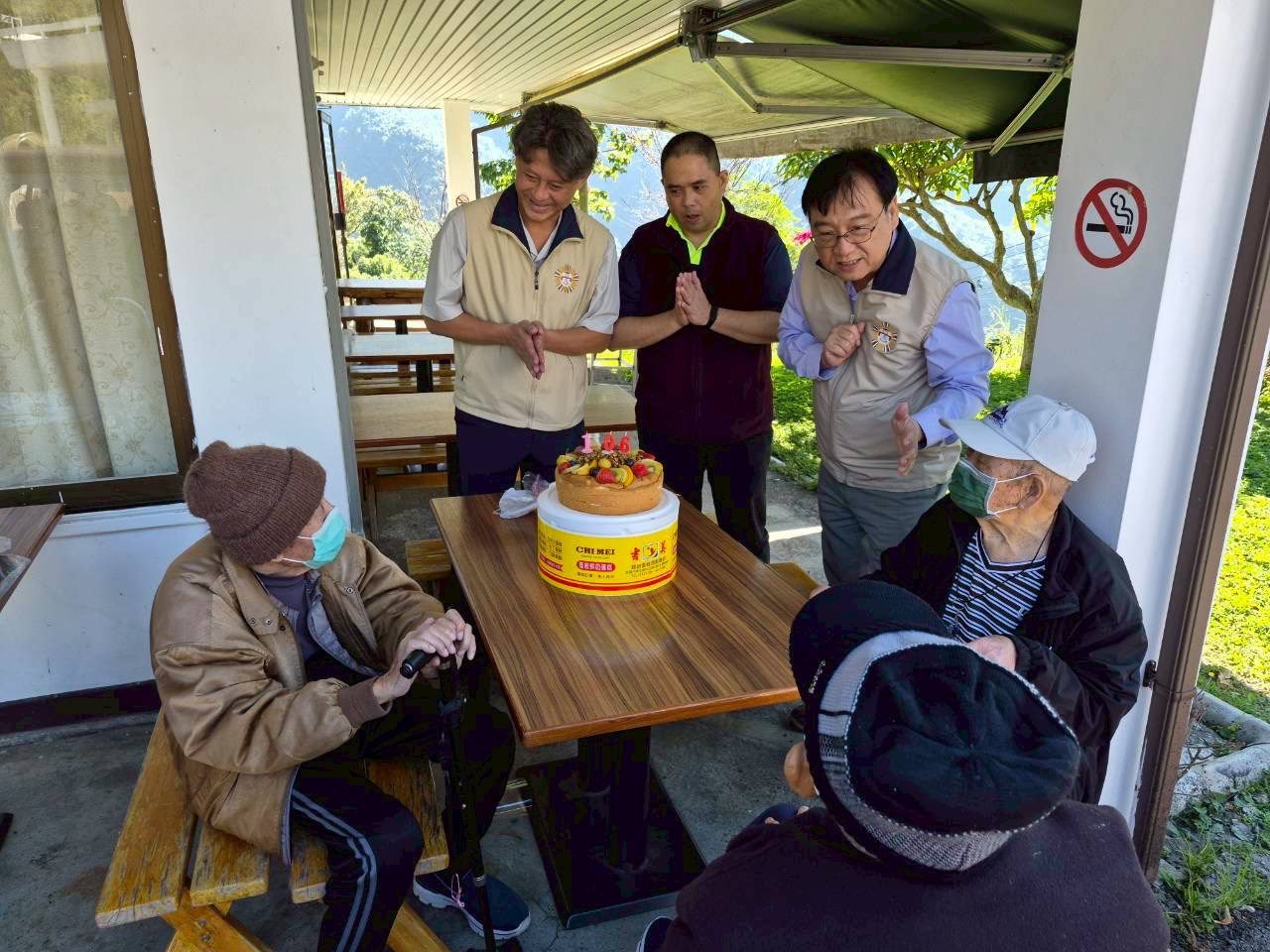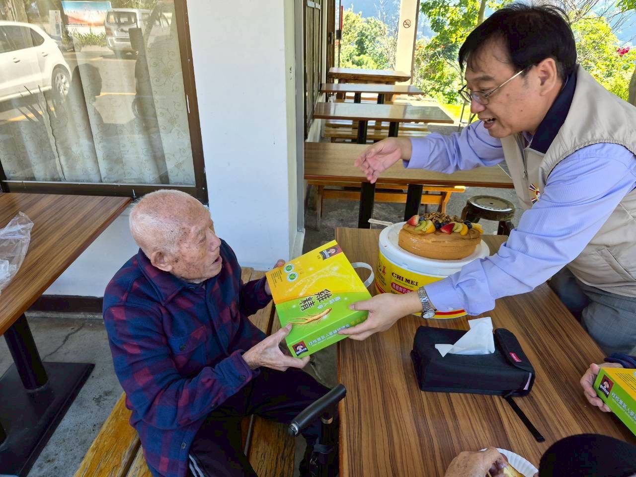 為讓住在山區年長的榮民也能感受到關懷,高雄市榮民服務處處長劉雅魁日前率領服務同仁,翻越蜿蜒山路前往高雄那瑪夏山區的錫安山,為多位年逾百歲的榮民伯伯送上生日祝福。服務團隊一行人帶著蛋糕、保暖外套、禮物與滿滿心意造訪,長者們看到熟悉的身影出現時,臉上立刻綻放出溫暖笑容,現場充滿濃濃的人情味。