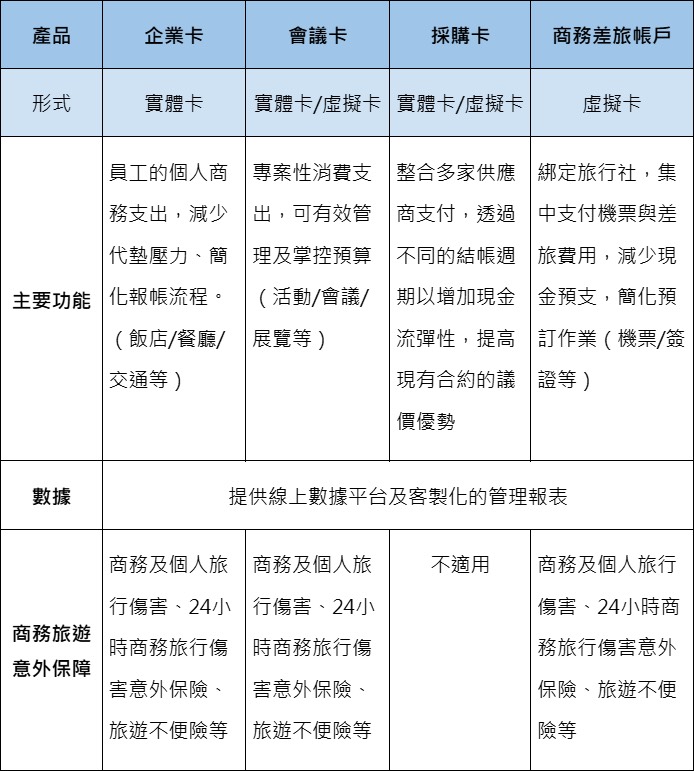不同於個人信用卡,企業卡由公司統一管理,可依需求設定額度並分配給員工使用,確保支出透明可控。企業卡能自動對接大多數企業會計系統,即時彙整消費數據,簡化報銷流程,減少人工處理,提高財務效率。此外,企業卡提供多種責任保障選項,企業可靈活選擇最適合的方案,有效降低財務風險,確保資金運用更安全、精準且高效。
