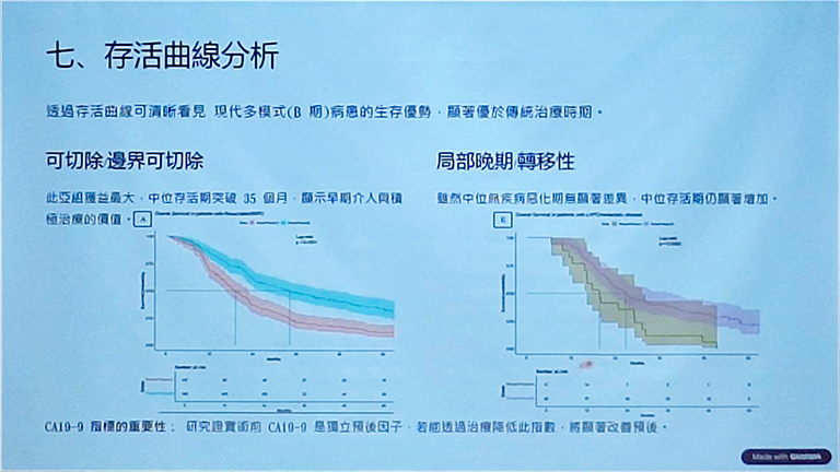 廖亭凱醫師分析成大醫院2011至2022年間共405位接受胰臟癌手術的病人,並分為早期(2011-2017)與後期(2018-2022)兩個時期比較。研究結果顯示,術前化療使用率由22%提高至75%,擴大切除手術比例也由31%上升至58%,成功讓更多晚期病人轉化為可切除族群。整體中位存活期由19.2個月延長至30.3個月,死亡風險下降49%,疾病惡化風險則降低37%。此外,擴大切除的手術死亡率也由10.4%降至2.1%,突顯團隊在高難度手術與照護方面的成熟經驗。