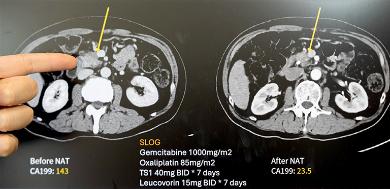 62歲的王先生出現體重減輕與黃疸症狀,經檢查確診為胰臟癌。影像顯示腫瘤已侵犯門靜脈,屬於「邊界可切除」階段。過去此類病人往往難以直接接受手術,預後也較差。經成大醫院外科團隊多專科評估後,王先生接受「術前化學治療(Neoadjuvant Chemotherapy, NAC)」合併「擴大胰臟切除手術(Extended Pancreatectomy, EP)」。歷經四個月化療,腫瘤明顯縮小,順利完成合併血管重建的胰十二指腸切除術。術後追蹤兩年,病人恢復良好、生活如常。