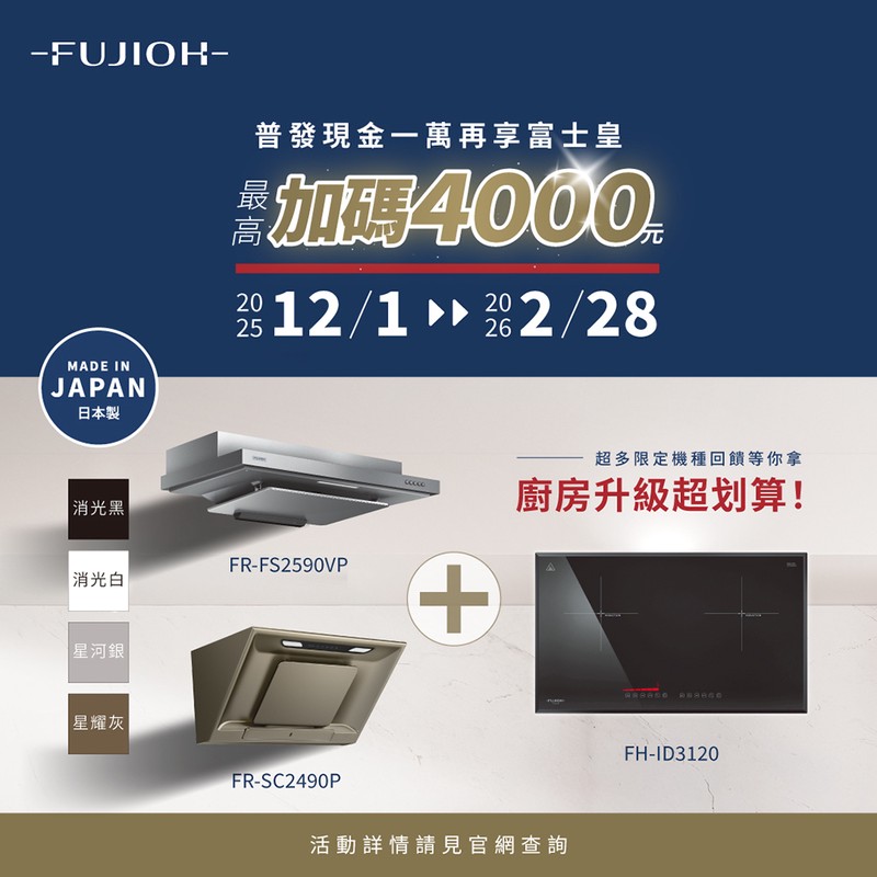 搶攻年底換購廚房家電,加上全民普發一萬元,富士皇讓現金變大,廚房質感同步升級。想提昇廚房美學的民眾,不妨把握購買千載難逢的好品牌廚房家電的好時機。