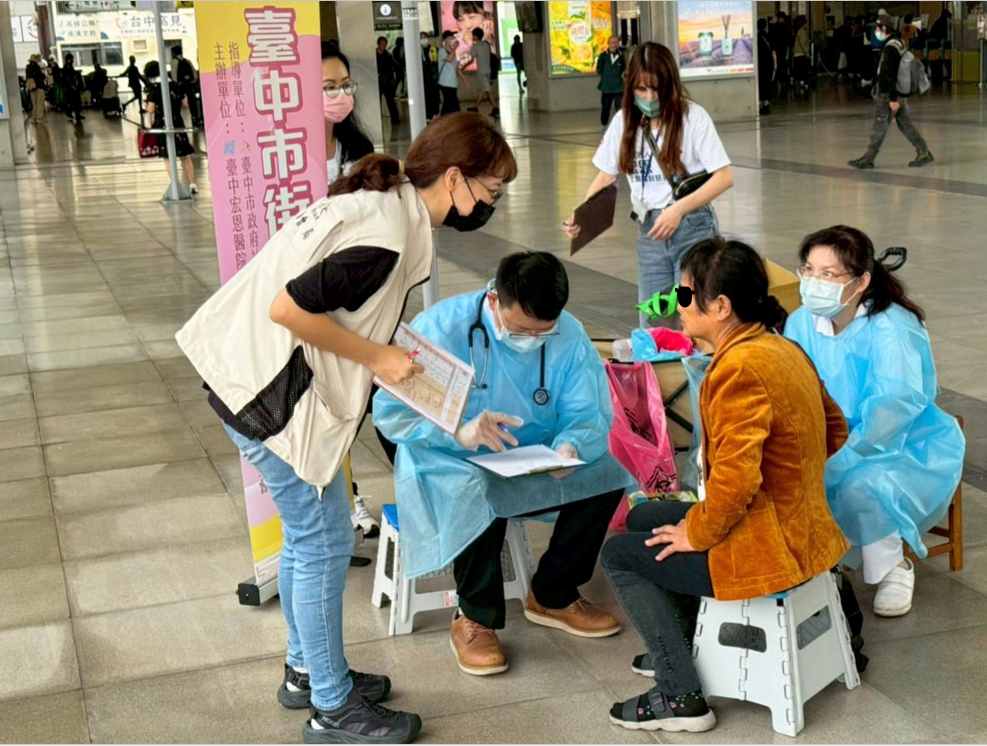 受限於經濟、交通及心理等因素,許多街友沒有定期就醫或追蹤健康狀況。台中市政府社會局攜手宏恩醫院及中國醫藥大學醫療團隊,主動提供醫療照護,9月起展開5場次街頭醫療服務,在台中車站為78名街友量測血壓血糖、包紮換藥與衛教宣導,希望提升街友的健康意識,加強疾病預防與即時就醫的觀念。