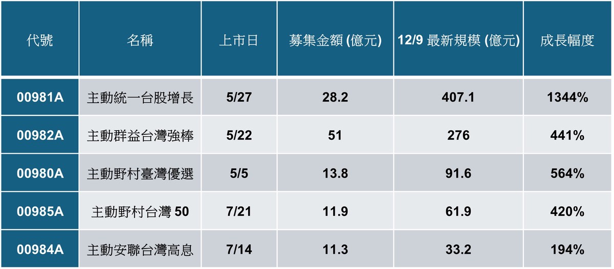 盤點今年首波(5~7月)掛牌名單,表現最狂的當屬 00981A 主動統一台股增長,這隻「吸金怪獸」挾著超過 60% 的鬼神績效,規模在短短半年內從 28.2 億元暴風膨脹至 407.1 億元,成長幅度是驚人的 1,344%!目前它不僅是主動式 ETF 王者,更殺進全台股 ETF 規模排行榜第 13 名。而 00982A 主動群益台灣強棒亦不遑多讓,規模從成立時的 51 億元激增 441% 至 276 億元,穩居第二。
