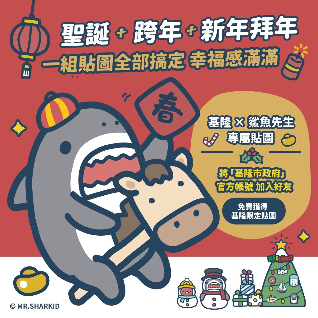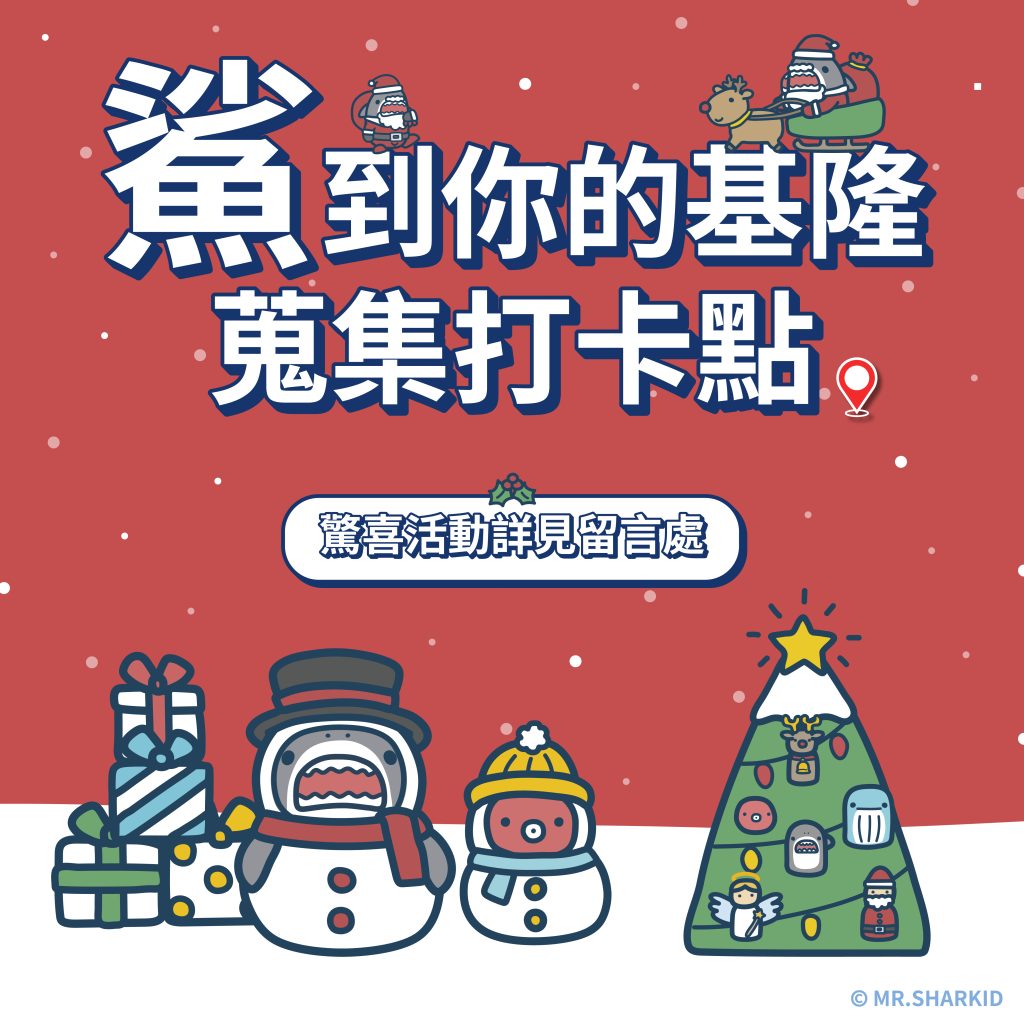 同時推出「鯊」到基隆聖誕驚喜打卡活動,開放募集遊客們的「基隆魔幻時刻」。凡拍下海洋廣場光環境照片分享至個人FB,打卡於「海洋廣場」,同步將貼文設成「對所有人公開」,並於留言區留下「我在聖誕樹下許願!」,即有機會獲得豐富的聖誕大禮,獎品清單豪華吸睛:包括頭獎 Apple Watch SE 3 (1名)、PHILIPS 飛利浦氣炸鍋 (1名),以及家樂福禮券 500 元 (5名)等。所有得獎者更將額外獲贈「基隆文化觀光局與鯊魚先生合作專屬限定紀念商品」乙份。另外「鯊到基隆」獨家line貼圖同時上架,歡迎喜愛MR.SHARK的行家們下載使用,讓超萌的「鯊騎馬」陪你歡樂180天。下載網址 https://line.me/S/sticker/36577/?lang=zh-Hant&utm_source=gnsh_stickerDownloadComplete