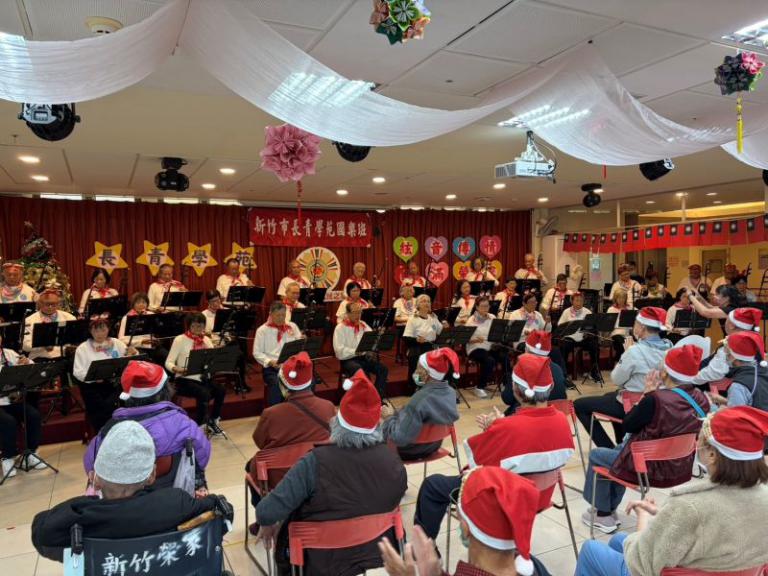 ▲長青學苑學員整齊編制登台演奏,多首經典曲目串聯,為榮家帶來溫暖樂章。(圖/記者蔣彤雲攝)
