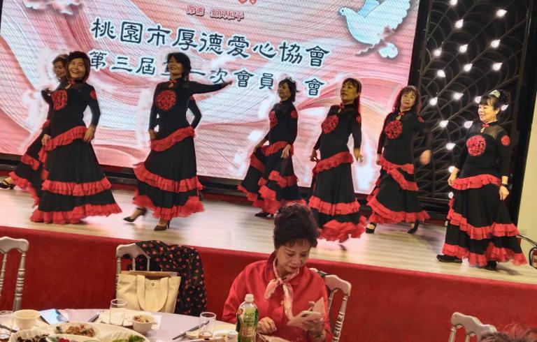 ▲桃園市厚德愛心協會理事長交接儀式中,穿插的熱場歌舞表演。(圖/記者范文濱攝)