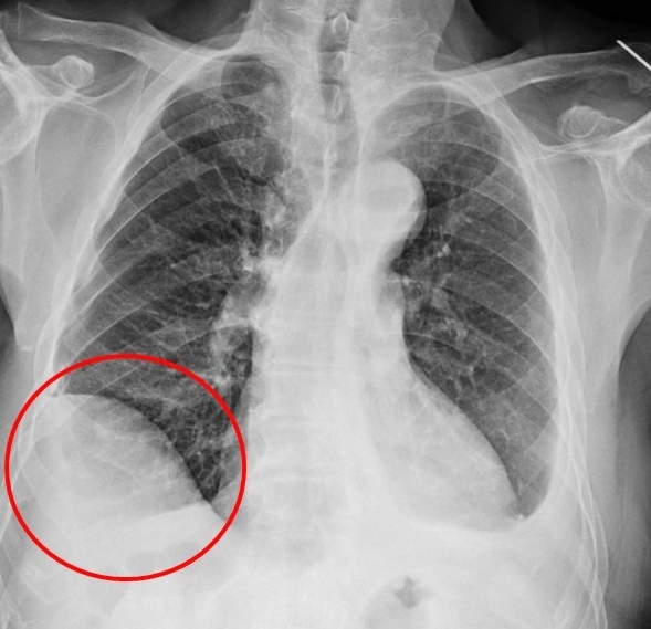 ▲病人創傷後橫膈膜沾黏,右側橫膈膜明顯升高。(圖╱仁愛長庚醫院提供)