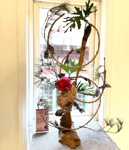 配合「茶花原樹」主題,20多幅展出的畫作中,有將茶花變身女帽裝飾、原住民豐收、還有茶花和縣鳥-五色鳥同框,在地藝術家匯客巿蔣育鳯老師,也帶領學員設計以「茶花原樹」為主題花藝展出。