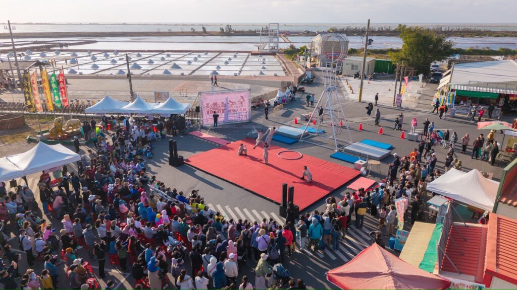 本次「神廟大馬戲」突破傳統舞台框架,將大型特技裝置移至宮廟廣場,演出團隊在高空巨輪上進行高速移動、平衡與翻轉動作,並藉由跑酷流動身法與高空走繩技巧,展現極高技術門檻與演出張力,搭配旁邊鹽田美景,讓觀眾近距離感受馬戲藝術的驚險與美感,也為北門廟埕地景注入全新藝術能量。同時,現場還有精彩魔術表演互動,讓父母小孩歡笑連連。