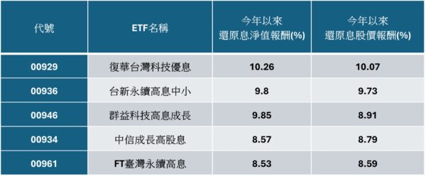 不只領息也要跟大盤!00929納權值股、今年報酬逾10% 居高股息ETF冠軍