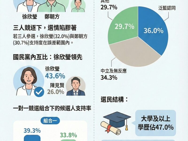 在「徐欣瑩與陳見賢」的黨內對比中,徐欣瑩支持度高達43.6%,大幅領先陳見賢的26.0%,雙方差距超過17個百分點。公信力民調分析指出,這樣的差距並非短期現象,而是已連續多月維持穩定。