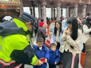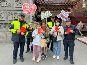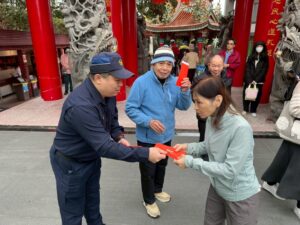 【民眾網編輯方笙楠臺北報導】農曆春節期間,走春祈福人潮絡繹不絕。內湖分局特別至轄內碧山巖開璋聖王廟,結合年節氛圍辦理交通安全及反詐騙宣導活動,並發送限量「豐年賀歲」紅包袋向民眾宣導拜年,祝福「新春順遂、闔家安康」。