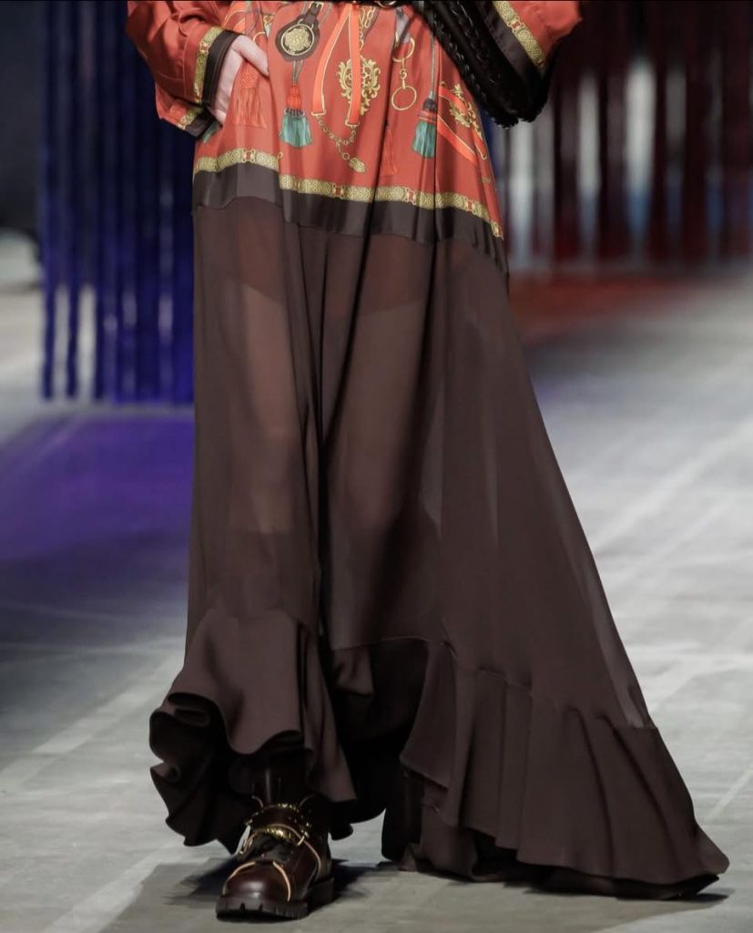 上身是絲質印花襯衫的濃烈;下身卻轉為深棕色的輕透長裙。若隱若現的處理方式,反而讓傳統印花不再壓迫,稀釋了過度濃烈的民俗風。