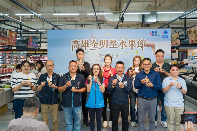「高雄全明星水果節」宣傳記者會今(7日)於家樂福鼎山店熱鬧登場,活動自4月8日至4月21日止,全台家樂福門市將同步上架來自高雄產地的精選蔬果,包含芭樂、香蕉、蓮霧、小番茄、青梅、天使甜瓜、鳳梨與百香果等多款人氣水果,攜手打造春季最具代表性的水果盛會。為深化「從產地到餐桌」的永續理念,現場特別邀請高雄綠色友善餐廳「而今餐酒館」跨界合作,發表專屬甜點「一梅雙韻 青梅饗宴」,展現農會、在地餐飲與通路攜手推動的友善飲食文化。