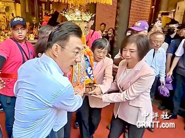 江啟臣、何欣純恭送媽祖神像入鑾轎。(中評社)