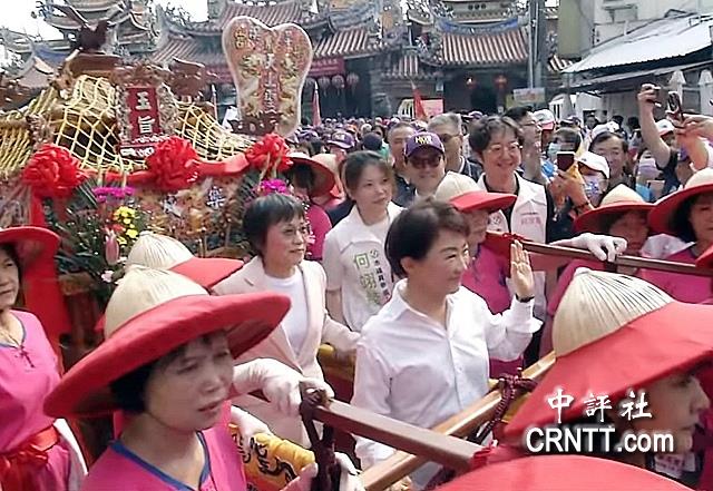 盧秀燕與劉世芳共同扶轎,與旱溪媽祖出巡。(中評社)