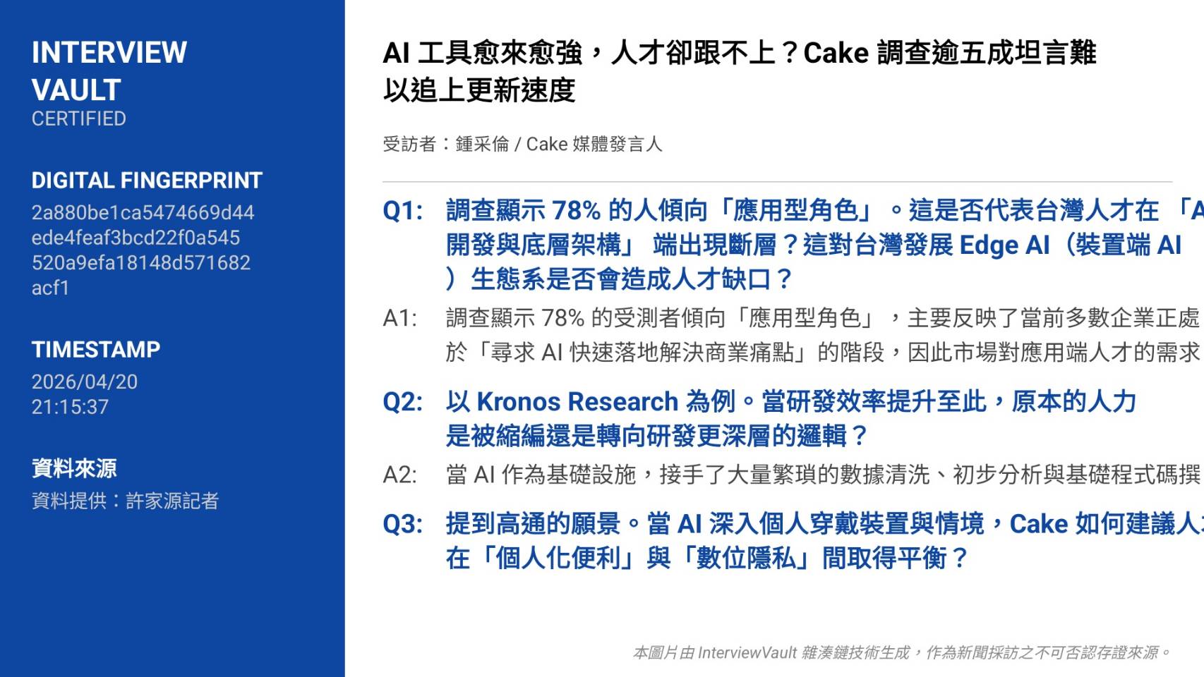面對AI深入個人穿戴裝置與情境的未來,Cake建議人才在擁抱技術時,必須將「Privacy by Design」內化為核心職能。Helen Chung提醒,Edge AI的裝置端特性正好能大幅減少敏感資料上雲的風險,無論開發者或應用端人才,都應主動學習資料治理、隱私合規與負責任AI知識。工作者在使用AI處理數據時,要堅守資料最小化原則並確保流程透明度;未來能在提升個人化體驗同時,又具備平衡數位隱私與架構能力的人才,將成為市場最搶手的跨界菁英,幫助台灣在AI從雲端走向裝置端的關鍵時刻繼續領先。