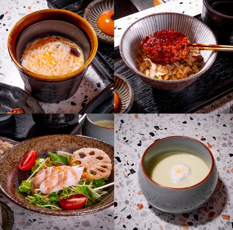 套餐內容:時令鲜漬蔬果、舒肥雞胸佐麻辣胡麻醬沙拉、主廚嚴選燒鳥五品(文昌雞雞里肌、皇金雞雞頸肉、皇金雞雞翅、皇金雞雞腿肉夾大蔥、皇金雞雞心)、炭烤季節時蔬(櫛瓜包番茄起司)、奶香絲滑毛豆冷湯、琉璃鱈蟹茶碗蒸、雞肉可樂餅佐塔塔芥末籽、松露玉子雞肉丸釜飯(搭配濃郁澄清黄金雞湯)、手作山藥冰淇淋佐莓果醬