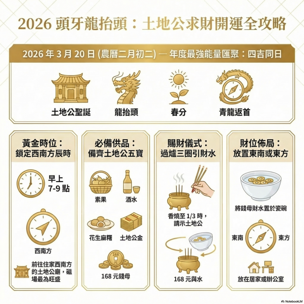 2026/3/20(農曆二月初二)是一個在民俗與命理學上極為罕見的能量匯聚點。這一天它同時疊合多重能量的意義:一是本日22:45分交逢廿四節氣,象徵陰陽平衡、陽氣上升的「春分」;二是民俗上代表生發啟動、萬象抬頭的「龍抬頭」;三是土地公聖誕、商家最重視的「頭牙」;四是象徵「龍抬頭」的辰時,在西南方位出現中國神秘奇門遁甲術「青龍返首」第一大好格局。這樣的日子,不只是拜拜而已,而是一年財運布局的起手式。