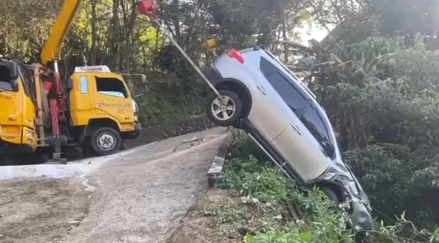 吊車將墜落山谷休旅車吊起。翻攝畫面